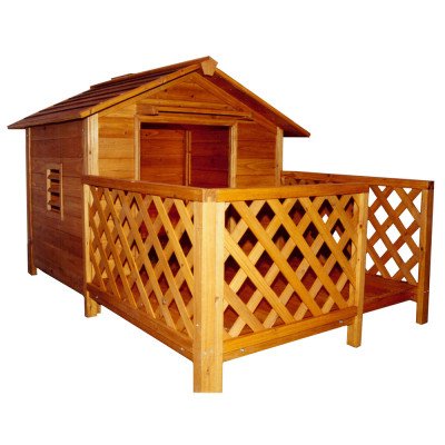 From sturdy craftsmanship to the stylish touch of a chimney this model has the perfect combination of size and comfort for medium-to-large dogs. The amply sized house which can fit two medium-sized dogs comes complete with a spacious front porch surrounded by beautiful lattice work. It also offers a window covered by downward sloping horizontal shades to allow for ventilation while keeping out the sun and rain. The overall size of this house will amaze you! This lightweight easy-to-handle house also features: Already assembled see-through door Removable roof and bottom panels for easy cleaning Raised bottom design keeps pets dry Stable and cellular structure of wood allows the pet house to withstand humidity and extreme temperatures Natural insulating feature of the wood is 2 to 5 times higher than any other materials used in pet construction With easy-to-follow instructions and all hardware included assembly time is approximately 20 minutes with a Phillips screwdriver. SIZE DIMENSIONS House external: 47W x 48D x 39H inches House internal: 39W x 40D x 35H inches Porch external 42W x 33D x 19H inches Porch internal: 32W x 39D inches Door opening: 18.5W x 22.75H inches