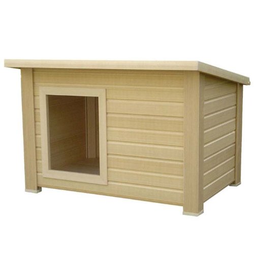 Rustic Lodge Style Dog House. ecoConcepts Rustic Lodge is an eco-Friendly, weather-proof, durable pet home made of ecoFLEX. ecoFLEX is made from 100% post consumer-recycled materials. ecoFLEX is insect proof, rot proof, and moisture resistant for easy cleaning and is maintenance free. Quick assembly with no tools needed. Rustproof, chrome plated steel inner structure. Flap door and custom fit padded cushion/mat available. Small size recommended for pets up to 20 lbs. Medium size recommended for pets up to 50 lbs. Extra Large size recommended for pets up to 200 lbs. Dimensions: Medium: 38" L x 29" W x 26.5" H; Weight: 42 lbs. Extra Large: 44.5" L x 32" W x 31.5" H; Weight: 68 lbs.