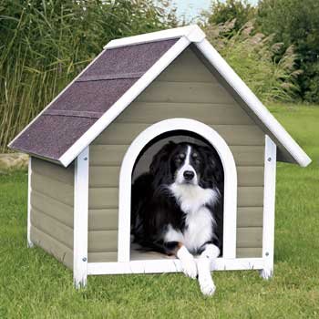Trixie Natura Nantucket Dog HouseGive your pet a place to escape the elements with this wood dog house with a classic pitched roof. Solid wood construction and the finest materials mean this dog house will endure years of use with very little maintenance. Benefits include an attractive gray/white weatherproof finish, tongue-and-groove construction and a durable split vinyl door. This dog house has adjustable extra-high plastic-tipped feet and a removable raised floor not found in many other dog houses, which is easy to clean. Assembly is quick and easy. The solid wood is attractively pre-stained gray/white with a weatherproof finish inside and out for added durability. The tongue-and-groove exterior protects against heat loss and draft. Our dog house features a composite shingled roof to withstand the elements. The extra-high legs help keep floor cool/warm/dry and promote air circulation underneath. Adjustable hard-plastic feet allow you to level shelter on uneven ground and also protect legs from decay due to ground moisture. The durable split vinyl flap makes it easier for your pet to enter and exit while keeping out debris.Sizing by breed: Size medium suitable for Husky or Border Collie.Sizing by breed: Size large suitable for Labrador or Chow.