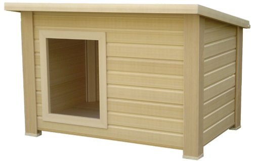 , weather-proof, durable pet home made of eCo-Flex. eCo-Flex is made from 100% post consumer recycled materials. eCo-Flex is insect proof, rot proof, moisture resistant. Assemble in minutes, panelized structure for no-tool assembly. Rustproof, chrome plated steel inner structure. Medium size. Recommended for pets up to 160 lbs. Flap door and custom fit padded cushion/mat also available.
